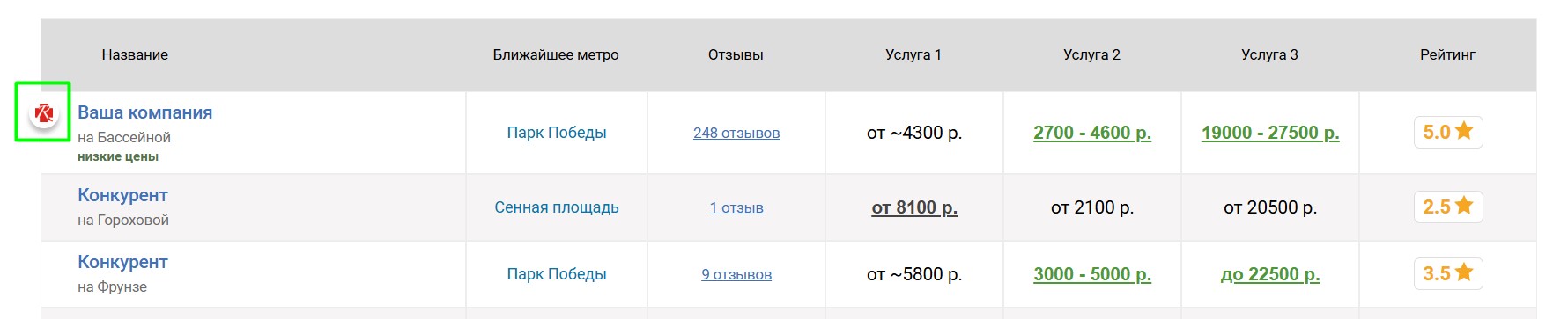 Иконка 16х16 пикселей будет отображаться слева от названия вашей клиники в таблицах, выделяя её среди прочих. Опция увеличивает вероятность перехода на страницу компании и рекомендуется в качестве дополнения к прочим методам продвижения, в первую очередь для клиник с узнаваемым брендом.